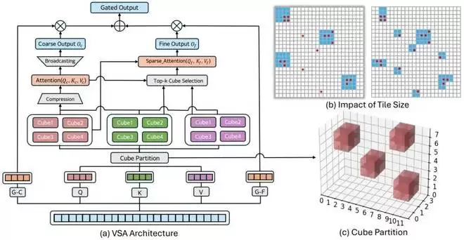 VSA 通过两阶段分层处理,先粗略聚合时空块找到关键区域,然后再对这些 top-K 的关键块进行密集的注意力计算。这套方案能在保证画质不降低的前提下,将注意力计算成本降低约 3 倍!