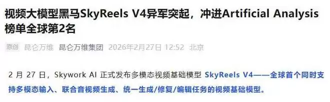 2026 年 2 月 27 日,昆仑天工正式发布多模态视频基础模型SkyReels-V4。该模型支持最高 1080p 分辨率、32 FPS 帧率、最长 15 秒的电影级画质输出,实现了音频与画面精准同步,并可全面覆盖从创意构思到精细修辑的一站式视频创作工作流。