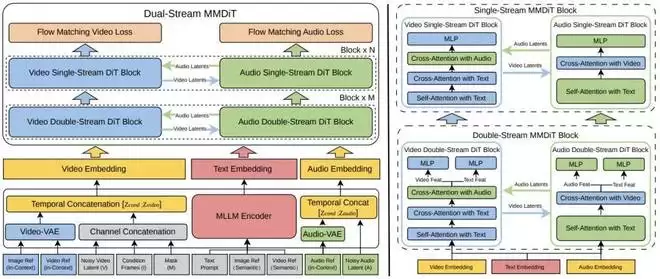 为了平衡模态对齐与参数效率,这套架构包含了混合的双流与单流处理模块。在前 M 层中,视频和音频保留各自独立的参数空间(如层归一化和 MLP 等),但通过联合自注意力机制进行交互 ;而在随后的 N 层里,模型会切换到单流架构,使用共享参数以提高计算效率。