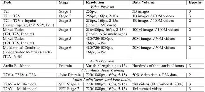 在最初的阶段,模型先从基础的 256px 文本到图像预训练开始,这一阶段使用了 30 亿张图像,专门用于打好空间构图和语义理解的底子。随后模型开始引入基础的视频片段,并在后续的训练中逐步扩展到 480px、720px 以及 1080px 的多分辨率混合训练。在最后的有监督微调阶段,该团队使用了 500 万条多模态视频数据,并叠加了 100 万条经过人工精选的高质量视频进行最终打磨。