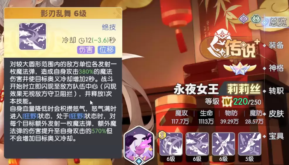 绝技“影刃乱舞”的机制稍微复杂一点。战斗一开始,莉莉丝就会闪现到敌方队伍中心,这个闪现还能无视守卫的阻挡,然后立刻释放一次影刃乱舞。这个技能会对范围内每个敌人发射魔法弹,造成攻击力280%的伤害,同时增加目标2秒的奥义冷却时间。莉莉丝血量降低时会积攒怒气,怒气满了进入狂野状态后,影刃乱舞会对每个目标多发射一枚魔法弹,额外那枚的伤害提升到攻击力的420%,不过不会再增加奥义冷却了。