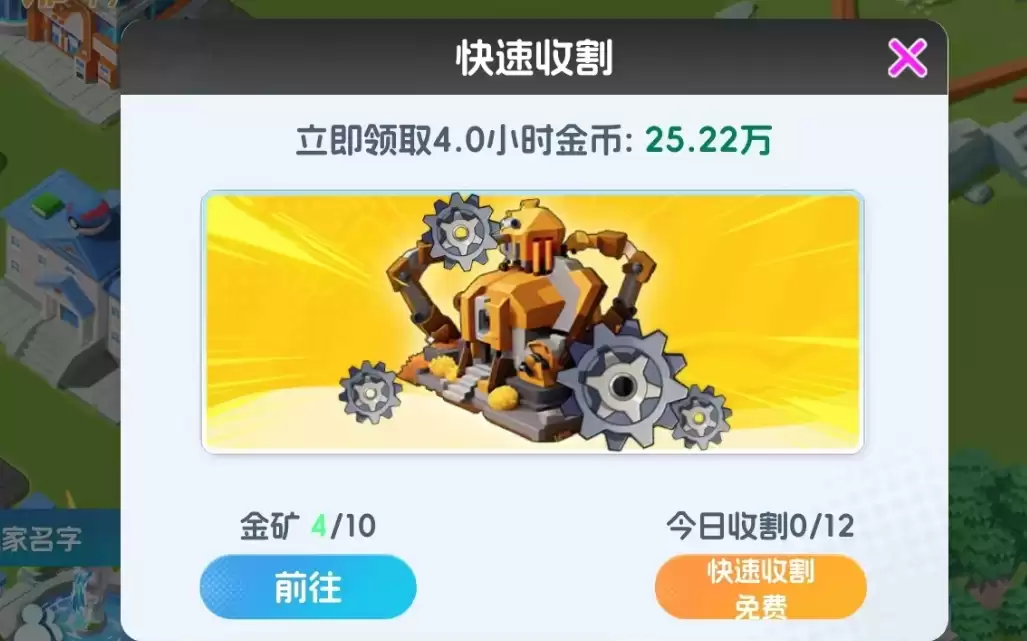 当然,金币收集器的功能不止于此。它还提供了快速收割功能,当玩家急需金币时,可以使用该功能立即获得一段时间周期内累积的金币产量。收割周期的时长会随着收集器的等级提升而增加,当收集器达到30级上限时,可以一次性收割5小时周期的产量。这种收割模式不会影响金矿的正常产出效率,属于让玩家额外获取金币的福利。每天可进行收割的次数有限,最高为12次,且前2次可免费收割,之后若想继续,则需要消耗钻石。