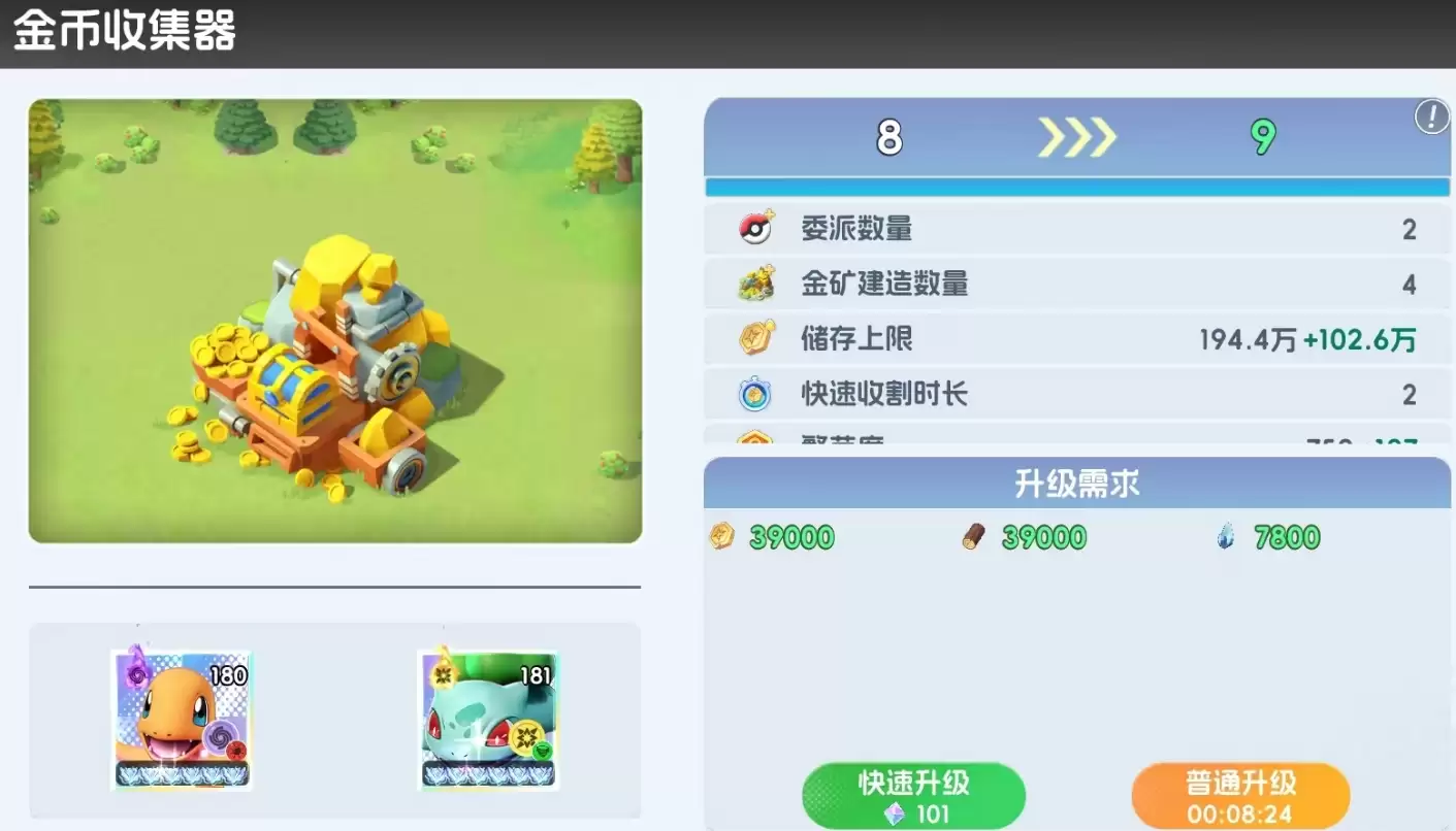 此外,金币收集器也属于可派遣宝可梦入驻的建筑。每只入驻的宝可梦都能为建筑提供增益,提高其金币产量。宝可梦的星级越高,带来的增益效果也越强。这个效果不仅能影响金矿的正常产出,连收集器里的快速收割产量也能享受到加成。升级收集器后,还能解锁更多派遣栏位,继续叠加此增益效果,最高可派遣三只宝可梦入驻(10级解锁)。