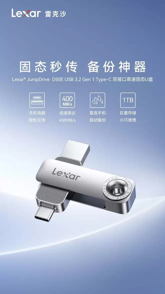 IT之家2月27日消息,雷克沙近期推出了一款1TB容量的USB 3.2 Gen1双接口高速固态U盘,型号为Lexar JumpDrive D50E,京东平台显示其售价为1119元。