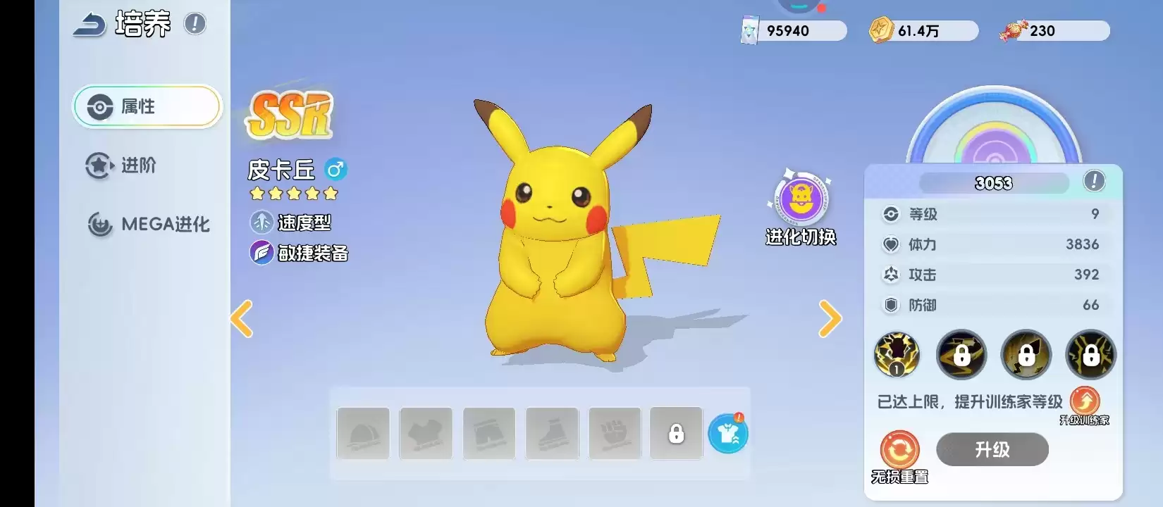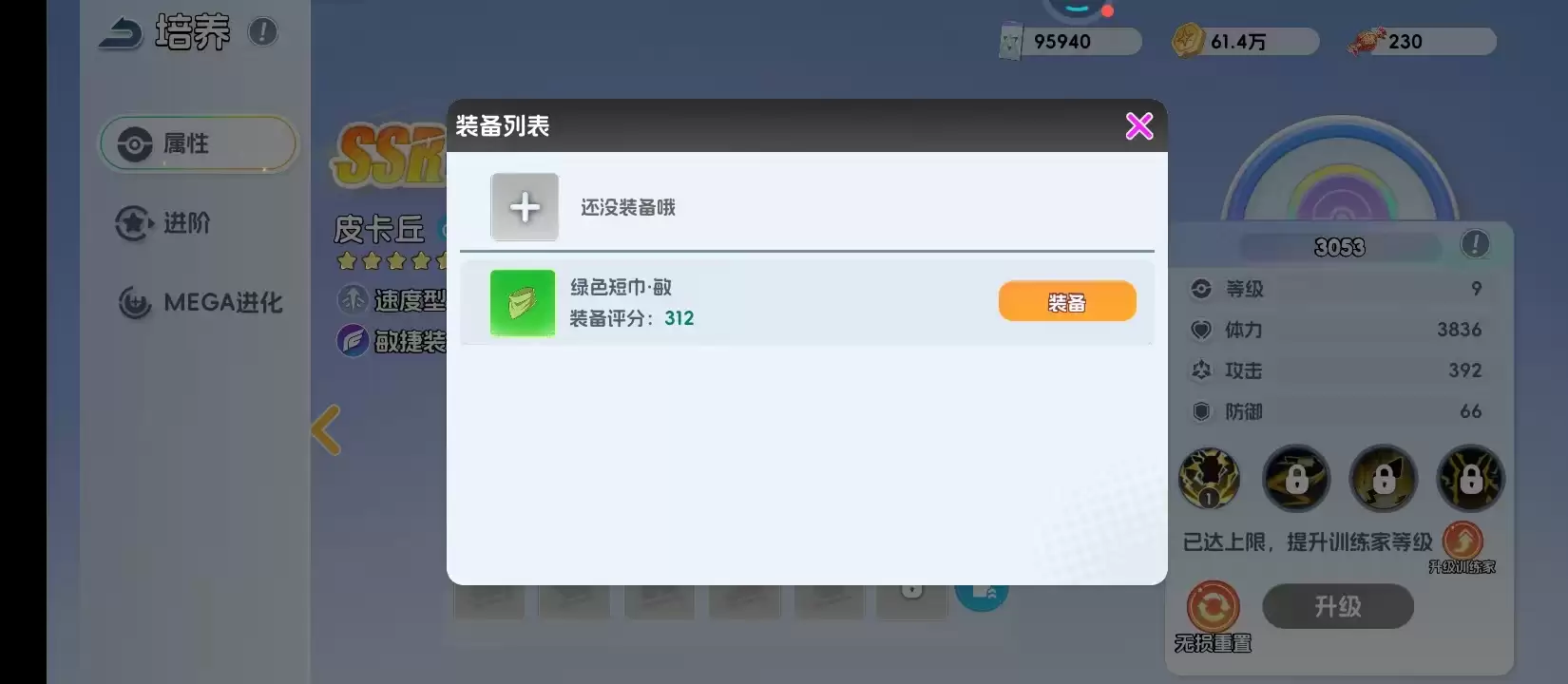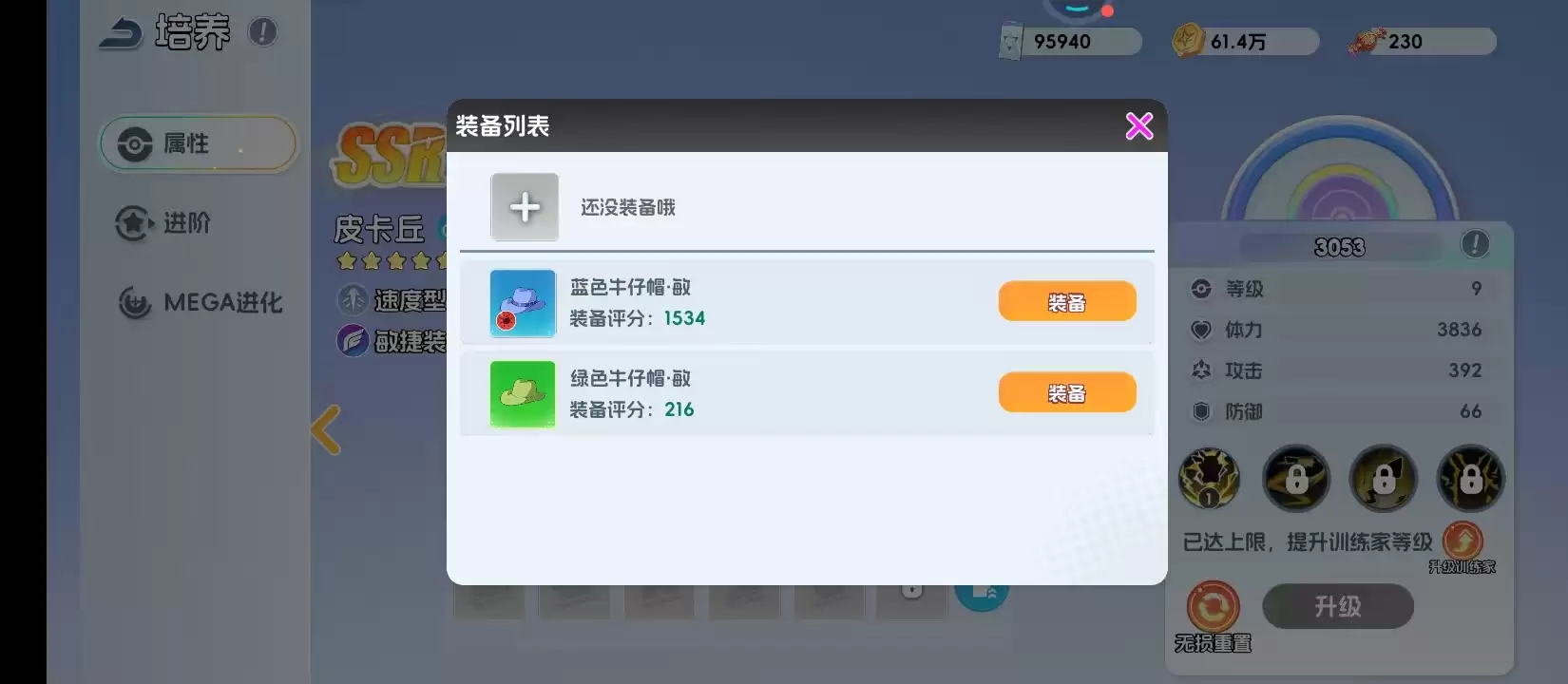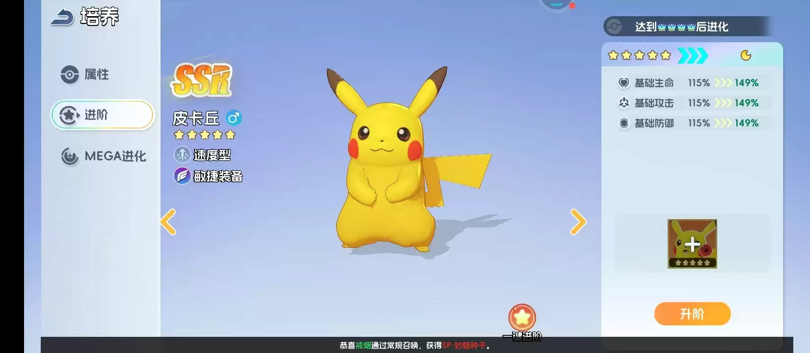 当玩家在获得皮卡丘之后,等级成长就会影响到速度,还有攻击面板。在进阶系统中,可以将基础生命,还有防御属性从原本的115%提升到149%这就是一个改变的关键。每一次的升阶都意味着在战场上,无论是输出上限还是生存能力都可以得到明显的提升。在装备列表中可以选择绿色短巾或者是蓝色牛仔帽。这一类敏捷装备就成为皮卡丘的主要选择,蓝色牛仔帽就可以带来可观的敏捷加成,强化速度优势。