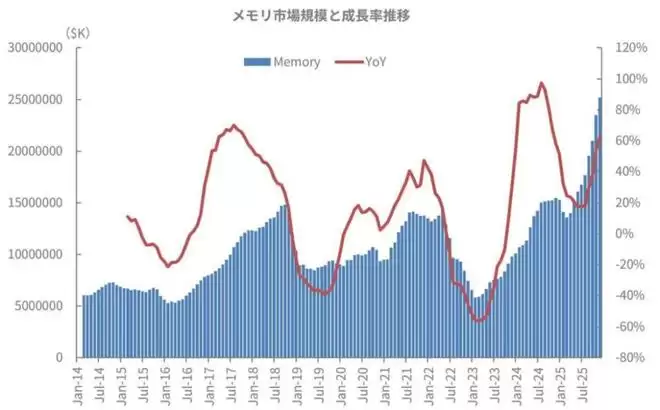 如上图所示,根据以往的模式,存储器市场增长率呈现四年周期性波动,在2017年中期达到峰值,2019年中期触底,2024年下半年再次达到峰值,2024年中期触底。按照这种模式,人们可能会预期峰值出现在2025年,谷底出现在2027年。