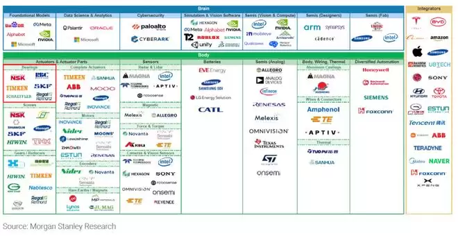 摩根士丹利此前编制的“Humanoid 100”名单(人形机器人 100 强公司列表)覆盖了全球 100 家上市企业,按“大脑”(Brain,即 AI 模型、半导体、视觉软件等)、“身体”(Body,即传感器、电池、电机、轴承、减速器等)和“集成商”(Integrators,即整机制造商)三大板块进行分类。轴承被单独列为“身体”板块中的一个子类别,与完整执行器、雷达与激光雷达、铝铸件等并列。