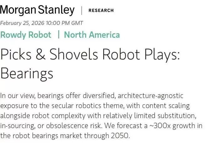 2026 年 2 月 25 日,摩根士丹利发布了一份标题颇为直白的研报:《Picks & Shovels Robot Plays: Bearings》(“铲子与镐”式机器人投资机会:轴承)。所谓“铲子与镐”(Picks & Shovels),是华尔街一个老说法,源自 19 世纪加州淘金热,即真正赚到钱的未必是淘金者,反而是卖铲子、镐头和牛仔裤的人。摩根士丹利这份报告的核心观点是:在机器人产业即将爆发的前夜,轴承可能就是这个时代的“铲子”。