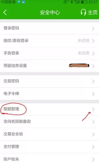 随后,你将进入安全中心界面。在这里,请找到并选择“限额管理”,同样点击右侧的箭头进入;具体位置请参考下图的红色标记。