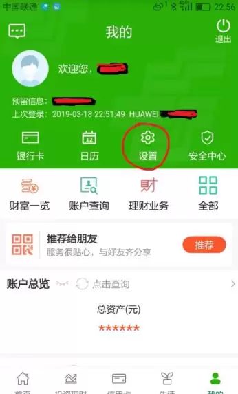 页面会跳转到“我的”界面,这里会显示你的银行账户信息。找到并点击“设置”选项,具体位置参考下图中的红色标记。