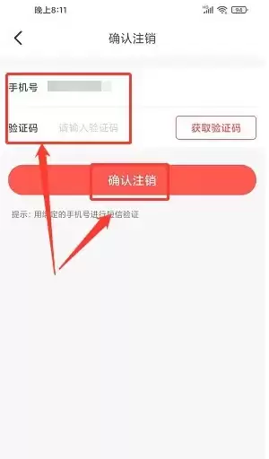 进入账户注销确认页面,输入你收到的验证码,然后点击“确认注销”按钮即可完成操作,具体步骤参照下图。