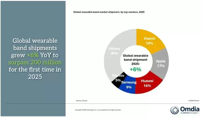 从调研机构Omdia公布的数据来看,小米自2020年以来首次重返市场榜首,以18%的份额成为全球可穿戴设备出货量最高的厂商。苹果以17%的份额紧随其后位列第二,华为凭借16%的份额位居第三,三星和佳明则分别以9%和5%的份额排在第四、第五名。值得注意的是,市场集中度正在进一步提升,前五大厂商占据主导地位,而前三名之间的竞争尤为激烈,份额差距微乎其微。