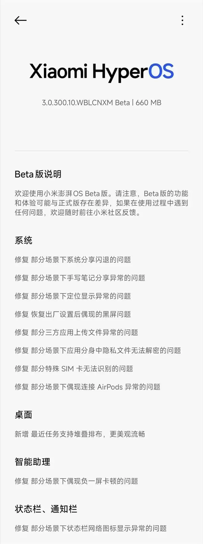 以及修复应用分身中隐私文件无法解密、修复特殊SIM卡无法识别、修复连接AirPods异常,就连负一屏卡顿、状态栏网络图标显示异常这两个老问题也在修复列表里。