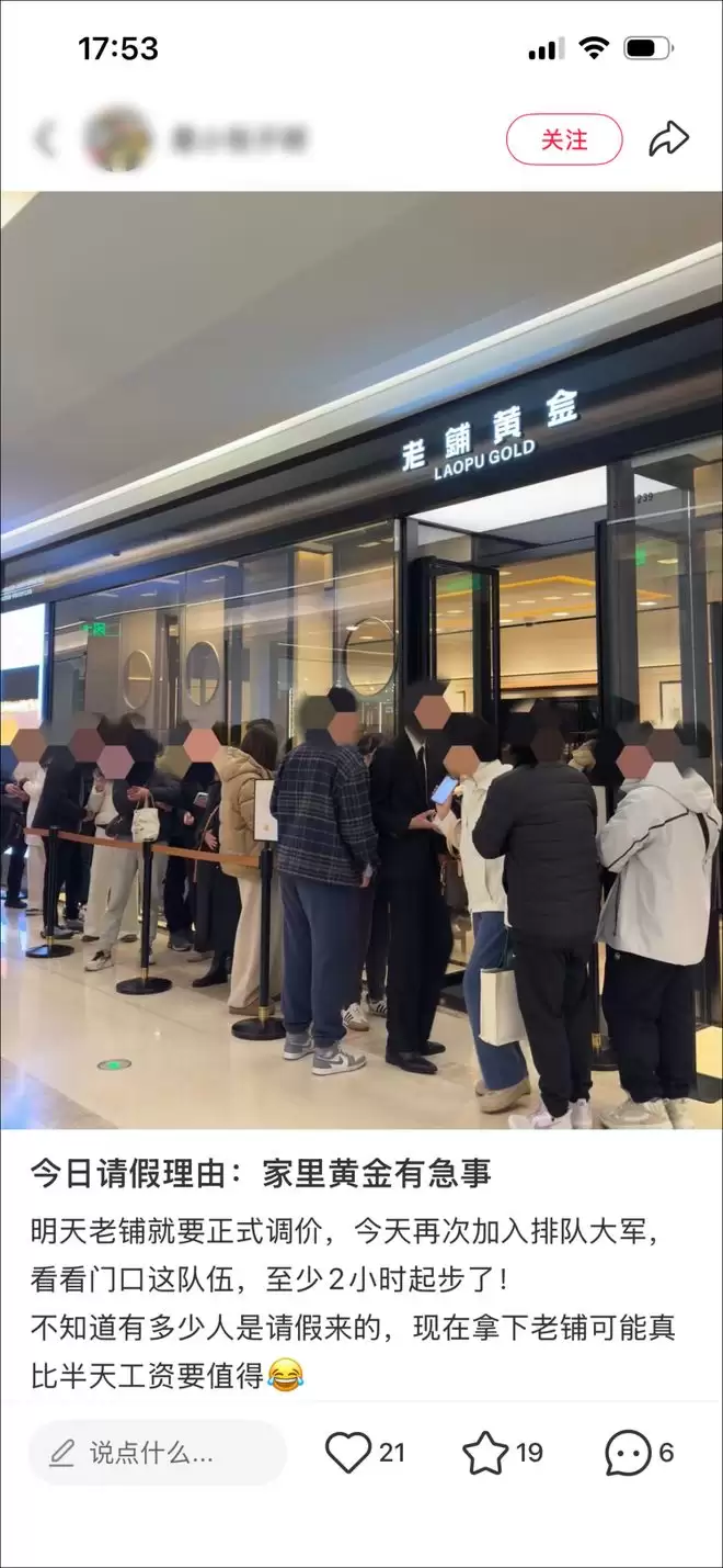 还有网友说,工作日逃班去老铺黄金,结果人傻了。“老铺的门还没看到,就先看到人,你们都不用上班嘛!”