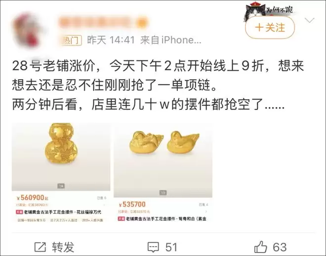 抢购的背后,除了天猫大促,还有两个因素在推波助澜:一个是即将调价预期带来的“赶在涨价前入手”心理,另外是老铺黄金独有的品牌魔力。