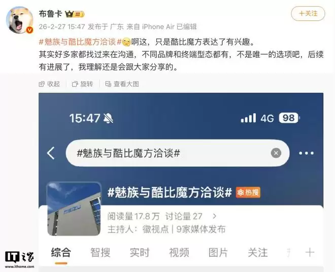 IT之家2月27日消息,博主@布鲁卡今日在微博谈及了“魅族与酷比魔方洽谈”事件,并表示: