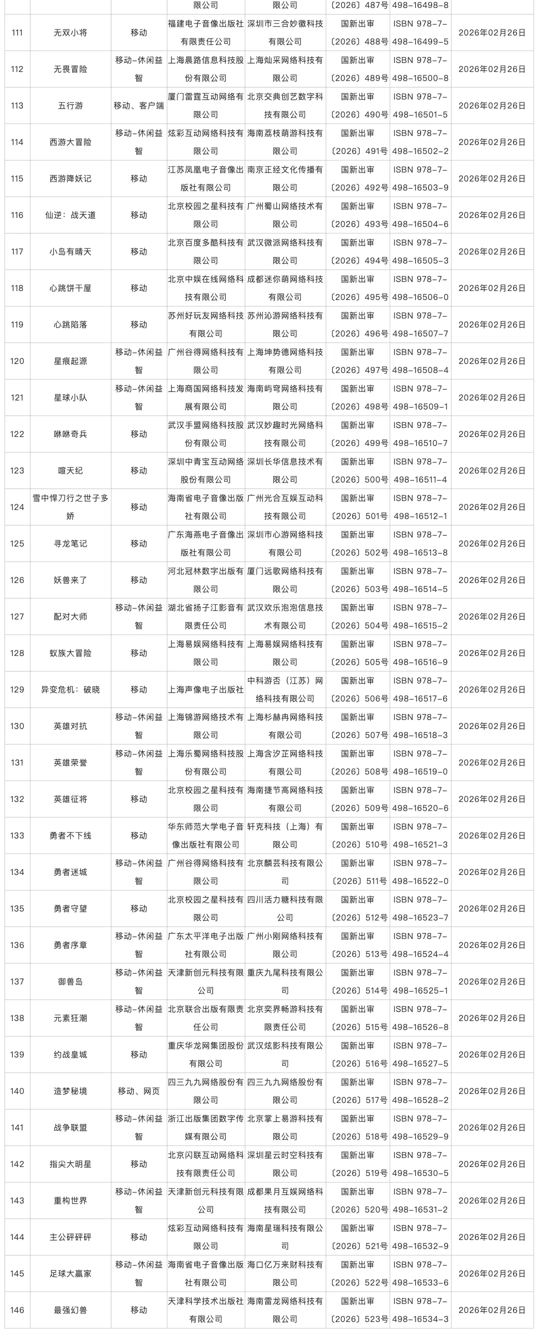 近日,国家新闻出版署公布了最新一批国产网络游戏的审批结果。根据2026年2月发布的审批信息显示,共有146款国产网络游戏顺利通过审核,成功获得版号。