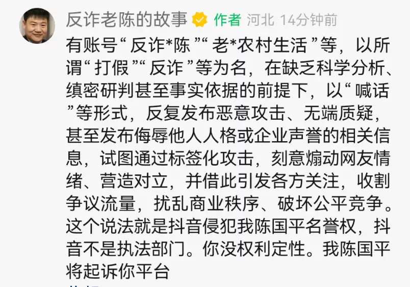 "反诈老陈"表示,自己问心无愧,将对抖音平台的处置决定提起诉讼。