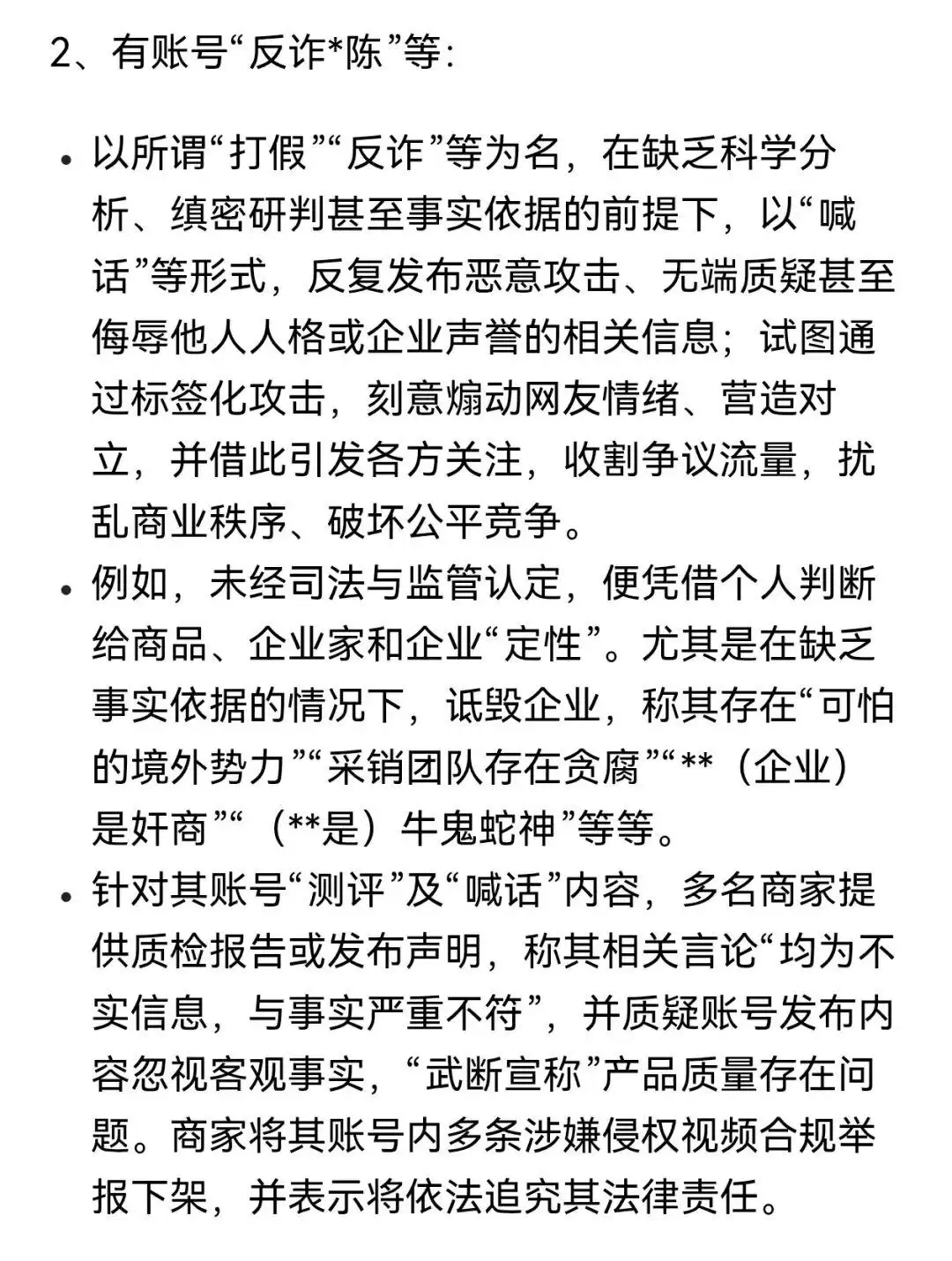 2月27日,抖音黑板报发布通告称,平台在日常巡查中发现,一些账号以"反诈*陈"等网络名称为幌子,在没有事实依据的情况下,以所谓"喊话"等形式,反复发布恶意攻击、无端质疑的内容,甚至传播侮辱他人人格、损害企业声誉的信息。这类账号试图通过标签化攻击来煽动网友情绪,刻意制造对立。