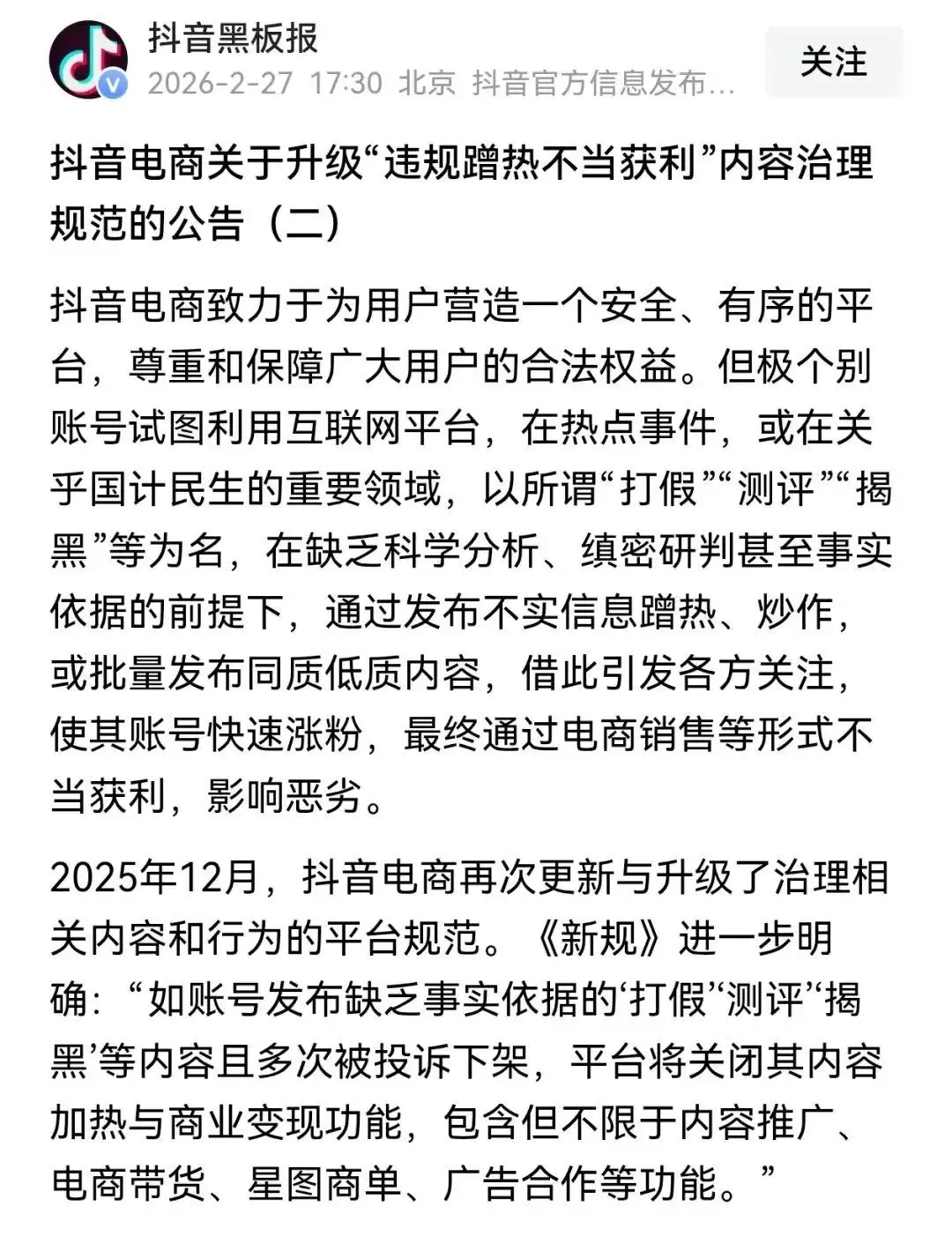 平台依据《抖音社区自律公约》等相关规定,对上述账号采取了关闭内容加热与商业变现权限的处理。相关限制包括但不限于内容推广、电商带货、星图商单、广告合作等功能。对于情节严重者,平台将进一步从严处置。