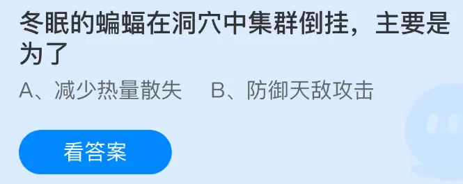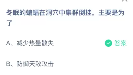 冬眠的蝙蝠在洞穴中集群倒挂,主要是为了什么?支付宝小鸡课堂开课啦!每天花一分钟答题赚饲料,喂喂小鸡就能贡献爱心啦!轻松又意义十足!2026年2月28日蚂蚁庄园的小鸡课堂题目正确答案是【减少热量散失】,蝙蝠选择在洞穴中集群倒挂越冬,首要目的是为了抱团取暖以减少热量散失。