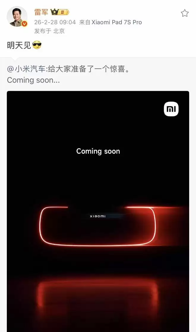 今天,小米汽车发布悬疑预告,文案是“给大家准备了一个惊喜。Coming soon...”。随后,雷军转发并配文“明天见”。