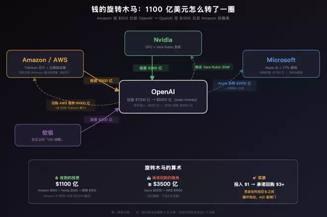 Amazon 先给OpenAI500 亿,OpenAI 再花 1000 亿买 Amazon 的服务。资金在两家公司之间转了一圈又回来了,只是中间多了几份合同和一个叫「AGI」的触发器。