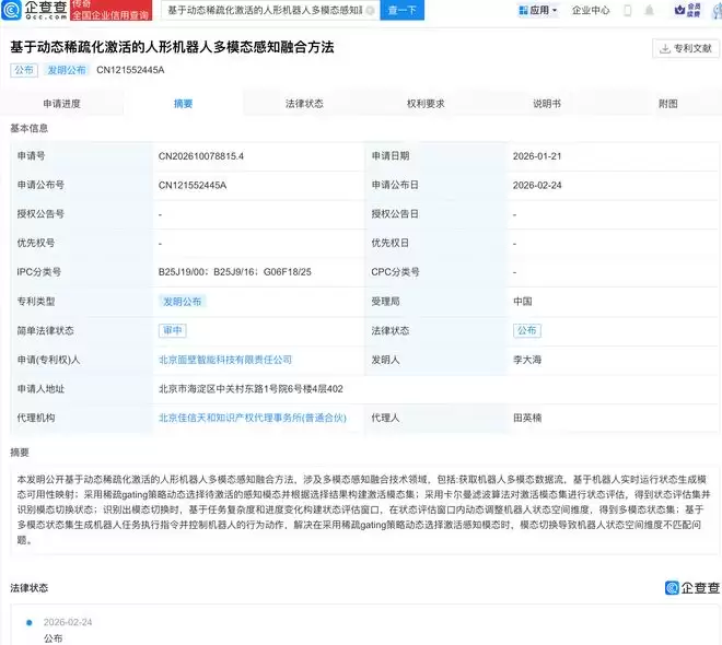 企查查APP信息显示,近日,北京面壁智能科技有限责任公司一项名为“基于动态稀疏化激活的人形机器人多模态感知融合方法”的专利正式公布。