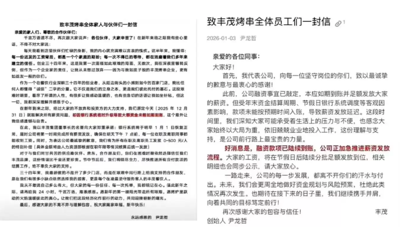 丰茂烤串欠薪闭店风波:创始人连发三封全员信回应