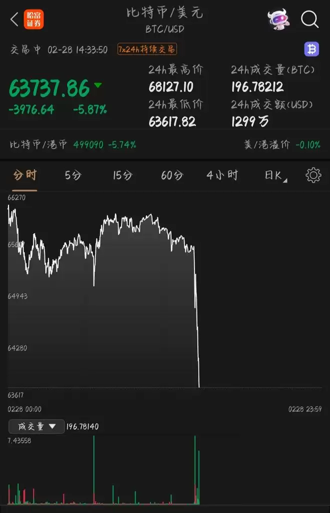 2月28日,比特币价格急剧下挫,单日跌幅接近6%,一度跌破3976.64美元,现报63737.86美元。