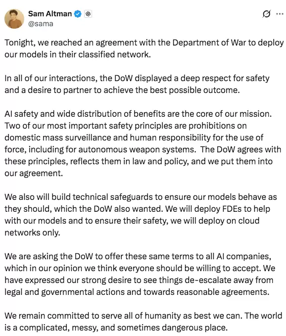 OpenAI与美国国防部达成合作:AI模型将部署军方涉密网络