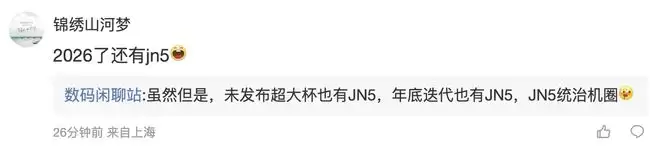 另一名用户则询问道:“2026 了还有 jn5”,博主则回复道:“虽然但是,未发布超大杯也有 JN5,年底迭代也有 JN5,JN5 统治机圈”。