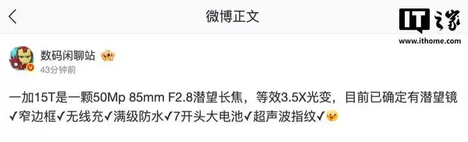 IT之家 2月28日消息,博主 @数码闲聊站 今日在微博上透露,一加 15T 手机将搭载 5000 万像素 85mm F2.8 潜望长焦镜头。