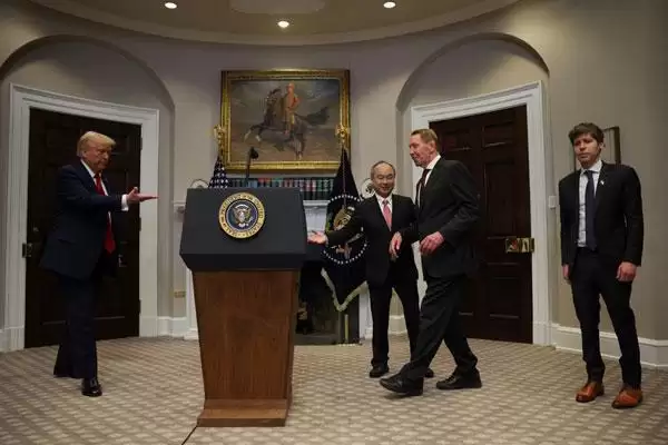 当地时间2025年1月21日,美国华盛顿,美国总统特朗普邀请美国甲骨文公司创始人拉里·埃里森(右二)发言。 东方IC