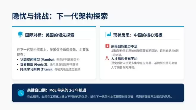 但隐忧同样存在。在下一代架构的探索上,美国仍保持微弱领先。状态空间模型(如Mamba)、世界模型(如Genie 3)、持续学习架构(如Titans)——这些可能接替MoE的方向,美国都走在前列。
