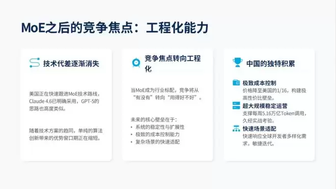 当美国也全面转向MoE后,竞争的焦点将从“有没有MoE”转向“MoE落地得好不好”。这方面中国有独特积累:成本控制能力(价格已是美国的1/16)、稳定性运营能力(支撑5.16万亿Token/周的调用)、场景适配能力(快速响应不同开发者的需求)。