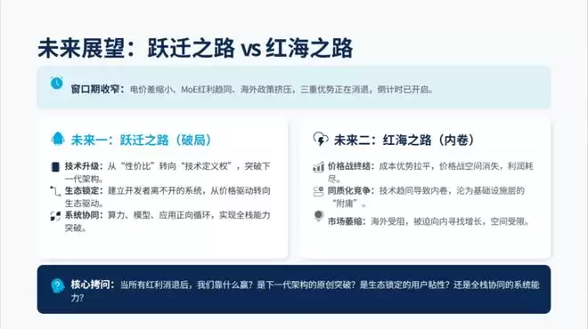 未来二:陷入红海。成本优势被拉平——当电价差缩小、MoE趋同,价格战的空间消失。技术趋同导致同质化竞争——大家都在用类似的技术,拼的是谁更能“卷”。海外市场受政策挤压——美国开发者市场萎缩,只能向内寻找增长。国内模型厂商在价格战中耗尽利润——最终沦为基础设施层的“附庸”,为云厂商、算力厂商“打工”。这是红海之路。易滑入,难挣脱。