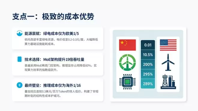 中国西部绿电价格约0.2-0.3元/度,仅为欧美的1/5到1/4。加上中国模型普遍采用的MoE架构,能让推理时的显存占用降低60%,吞吐量提升19倍。两者叠加,造就了0.3美元/百万Token的惊人低价——仅为海外对手Claude的1/16。