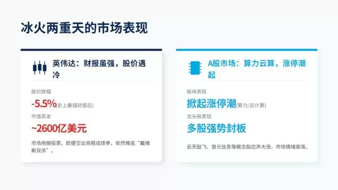 一边是英伟达发布史上最强财报后股价暴跌5.5%,一夜蒸发近2600亿美元;另一边是A股算力、云计算板块掀起涨停潮,云天励飞、普元信息等纷纷封板。