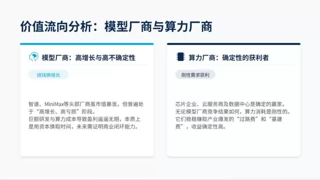 模型厂商虽然通过上市获得了巨额资金支持和市值溢价,但本质上仍在“用资本换时间”。未来3-5年,它们必须从“流量变现”转向真正的“价值变现”,否则可能面临市值回调的风险,甚至沦为基础设施层的“高级打工者”。