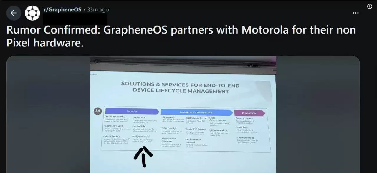 虽然这篇帖子很快被版主删除,但相关截图仍在网络流传。泄露的幻灯片标题为“端到端设备生命周期解决方案与服务”,其中明确列出了GrapheneOS。这暗示摩托罗拉可能将深度集成并适配该系统,而非简单的第三方移植。