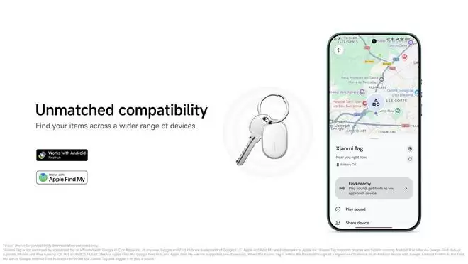 这款追踪器的一大亮点是同时兼容谷歌的 Find My Device 网络与苹果的 Find My 服务。这意味着用户无论是使用 iOS 还是 Android 设备,都可以方便地定位和追踪贴有小米 Tag 的物品。