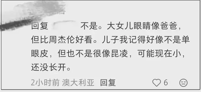 关于罗密欧长得像妈妈的说法,澳大利亚的网友在线辟谣,称周杰伦儿子长得跟昆凌没有特别像,眼睛不是单眼皮就是不像,可能没长开,而大女儿的眼睛像爸爸。