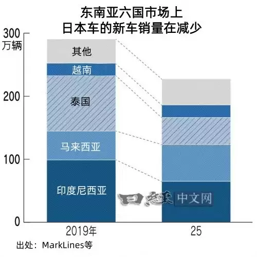 据MarkLines及各国行业团体的资料统计,2025年,在印度尼西亚等主要6个国家,日本车销量全部低于2024年水平。在东南亚主销国家,日本车全年销量为227万辆,较2019年减少22%。