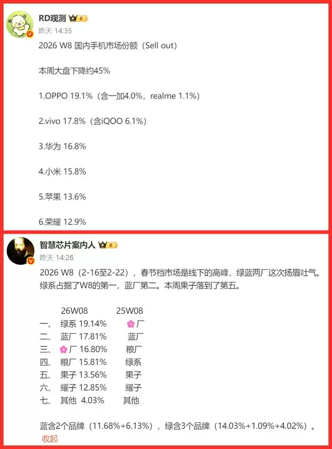 而且厂商的发展策略会体现在手机周报份额榜单中,比如2026年第8周(2月16日至2月22日),国内手机市场份额迎来开年最大洗牌。