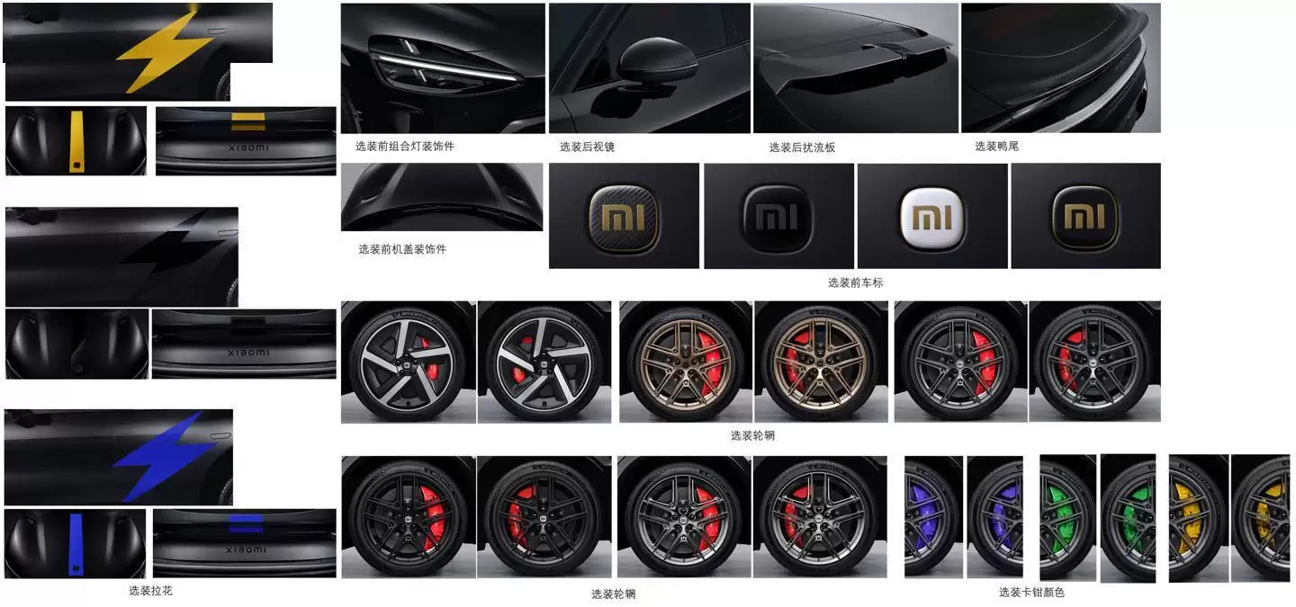 外观细节方面,新车延续YU7家族式设计语言,前脸标志性的“水滴大灯”采用镂空处理,搭配低风阻造型与无边框外后视镜,进一步强化空气动力学表现。从局部放大图可见,其制动系统配备碳陶刹车盘,轮毂规格为前265/40R21、后295/35R21,轮距分别为前1715mm、后1721mm。车身侧面设计10组贯穿式风道与19个导流口,配合电动内翻式门把手,既降低风阻又提升科技感。车尾部分保留小米SU7经典元素,包括动感小鸭尾与“光环尾灯”,同时采用夸张的立刀式扩散器,强化运动属性。
