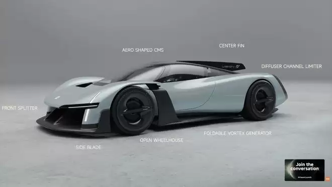 从侧面观察车身,驾驶舱呈现出悬浮的水滴状结构,外部气流可以直接越过车顶或穿过座舱下方的通道;底部的主动式扰流板会根据行驶状态,实时调节风阻与下压力的平衡。
