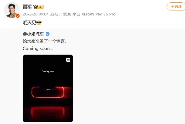 小米汽车最近动作频频,引发了市场的高度关注。2月28日,小米汽车最新的社交媒体账号发布预热信息称:“为大家准备了一份惊喜,即将揭晓……”随后,小米科技创始人雷军转发了这条动态并配文“明天见”,进一步点燃了外界的猜测。