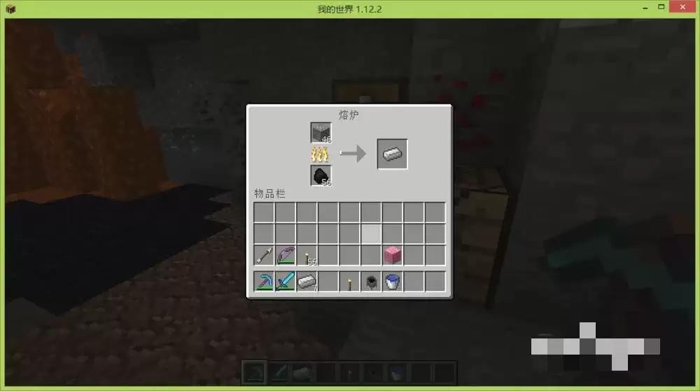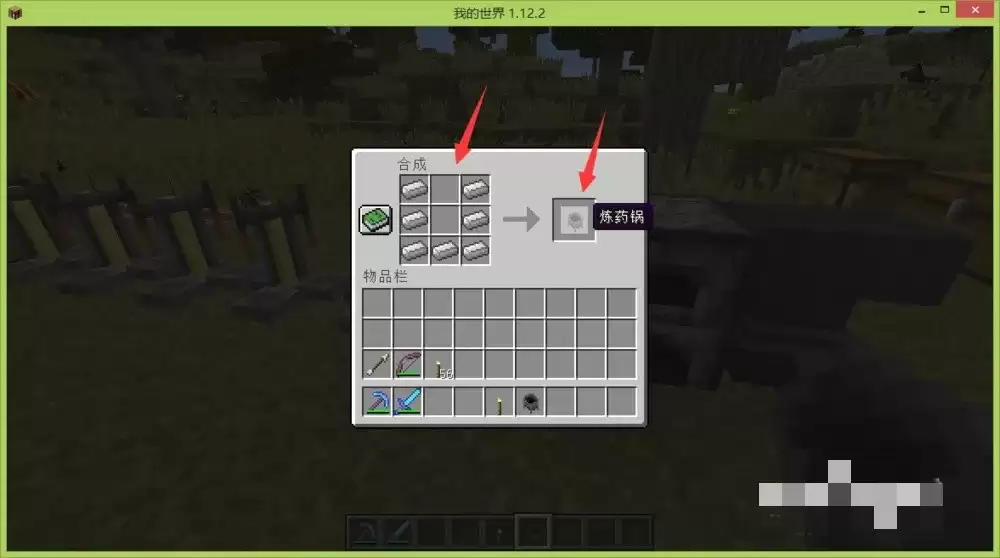 把挖到的铁矿石放进熔炉里烧制成铁锭,至少需要烧出7个铁锭。接着在工作台上摆放这些铁锭,排列成U字形,就能成功合成炼药锅了。