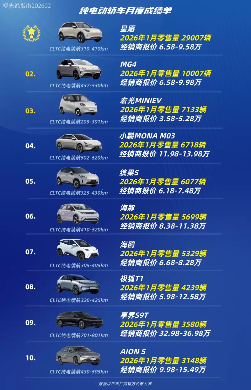 2026年1月纯电轿车销量榜揭晓:星愿登顶,市场消费新趋势